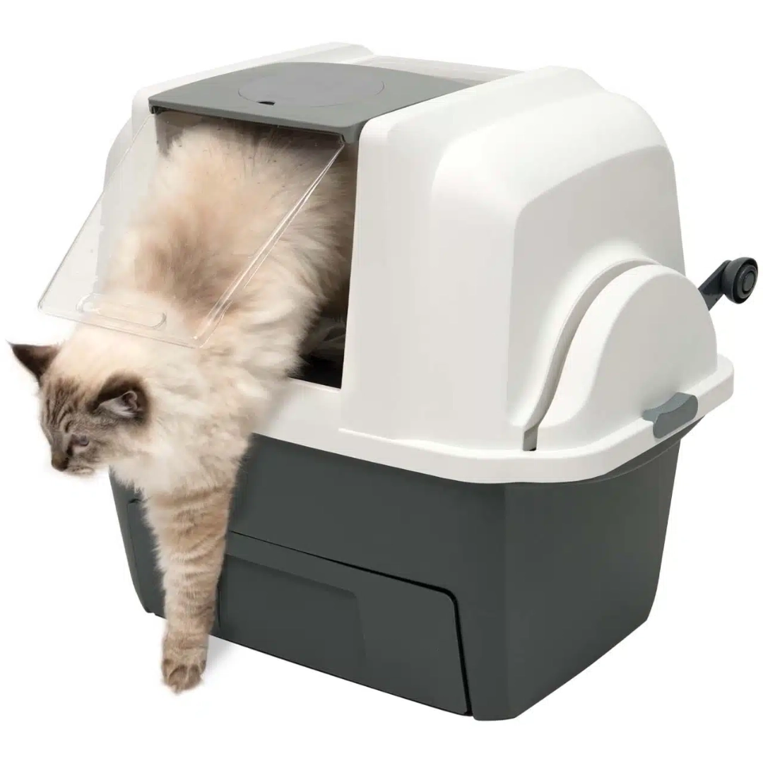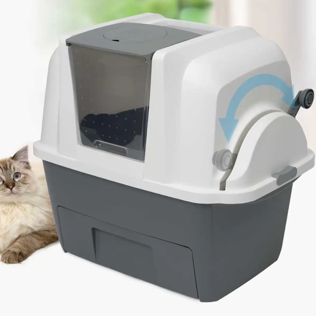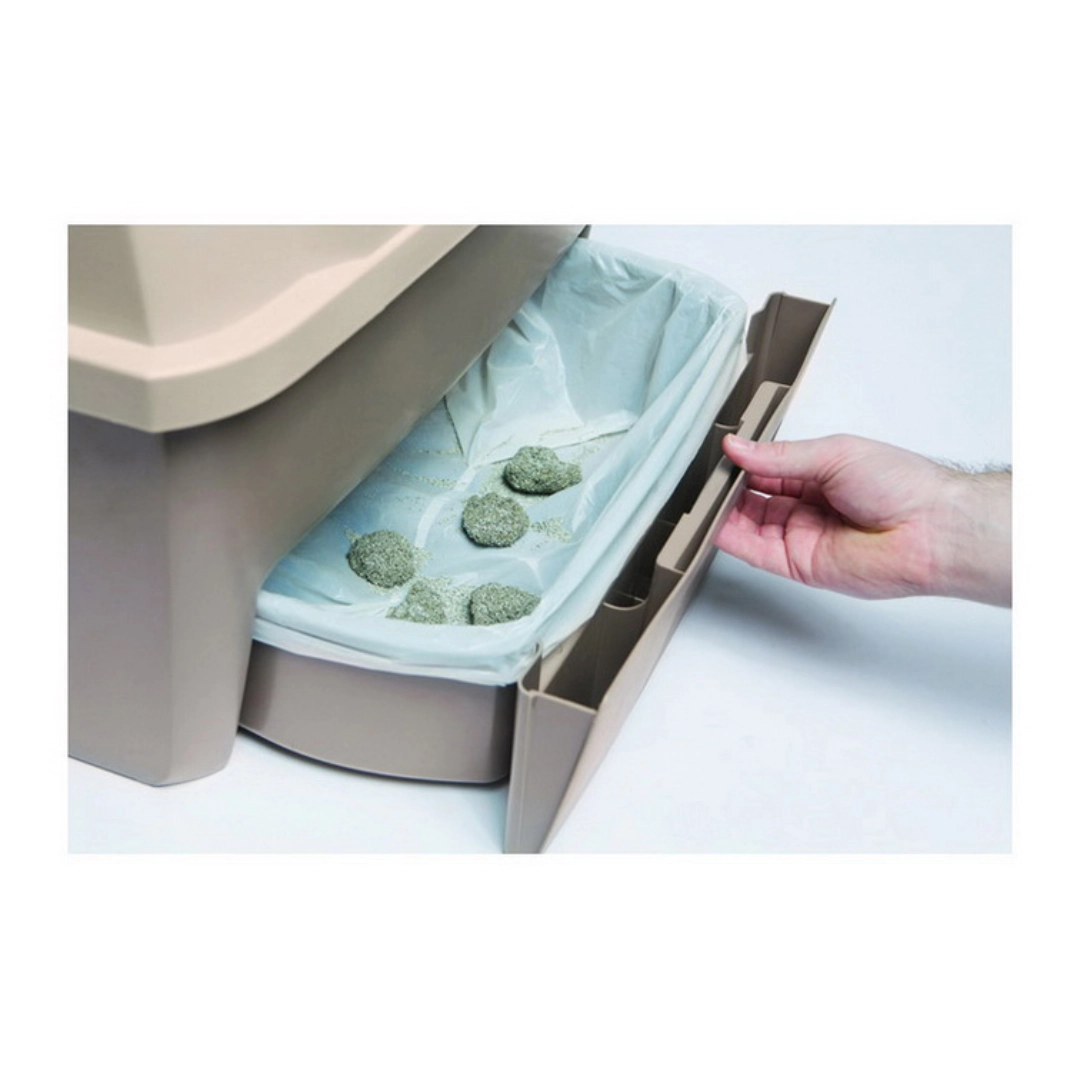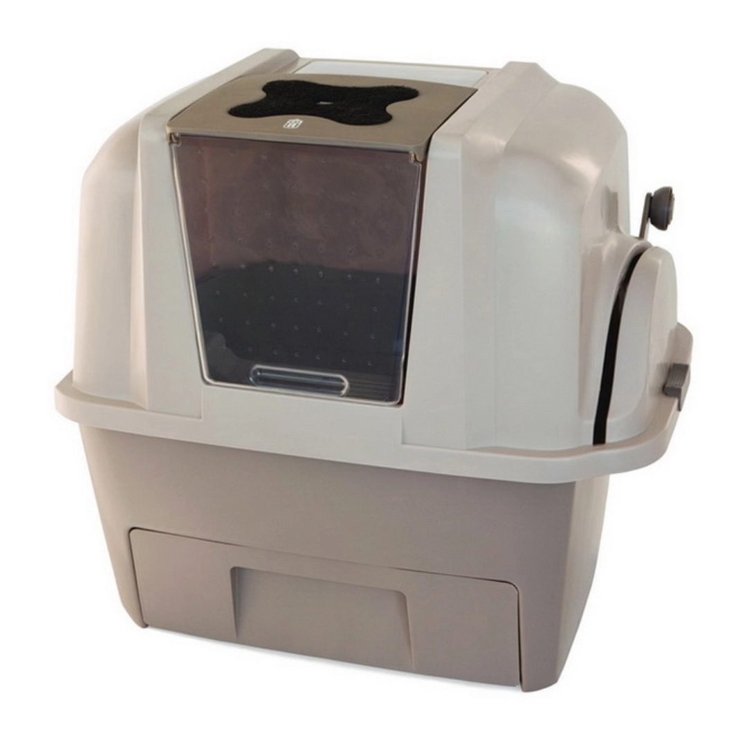 Catit Smartshift yarı otomatik kedi tuvaleti ile kumunuzu temizlemek artık çok kolay. Tek yapmanız gereken yandaki kolu çekip kumu elemek. Böylece kullanılmış kum alttaki çekmecede toplanacaktır.