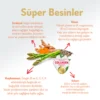 Kinoa: Tam bir protein kaynağı olan kinoa, kas gelişimini ve enerji seviyesini desteklerken, glutensiz yapısıyla kolayca sindirilir ve besin emilimini artırır. Yüksek lif içeriğiyle sindirim sağlığını iyileştirir, magnezyum, demir, fosfor, çinko gibi önemli mineraller ile B ve E vitaminleri sayesinde bağışıklığı güçlendirir; aynı zamanda güçlü antioksidan özelliğiyle hücreleri koruyarak parlak tüy ve sağlıklı cildi destekler.