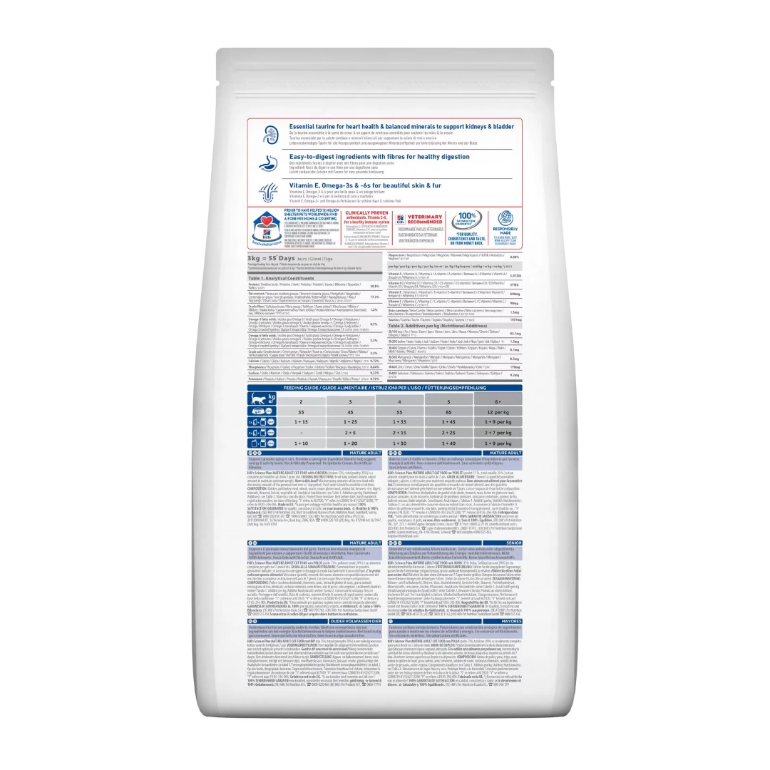 HILL’S SCIENCE PLAN Mature Adult kuru kedi maması kedilerde sağlıklı yaşlanmayı destekler. Enerji ve aktivite seviyesini desteklemeye yardımcı sinerjik bir karışım içerir. Kalp sağlığı için gerekli taurin ve böbrekler ile idrar kesesini desteklemek için dengeli mineraller. Sağlıklı deri ve parlak tüyler için E Vitamini, Omega -3 ve -6 yağ asitleri. Sağlıklı sindirim için sindirimi kolay, doğal lifli besin maddeleri.