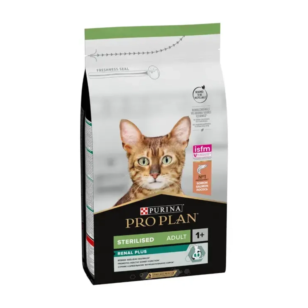 - PRO PLAN® Sterilised Renal Plus Somonlu tam kuru kedi maması, kısırlaştırılmış yetişkin kedinizin bir öğünde ihtiyacı olan tüm besinsel öğeleri içerirken kedinizin böbrek sağlığınının korunmasına destek olur.