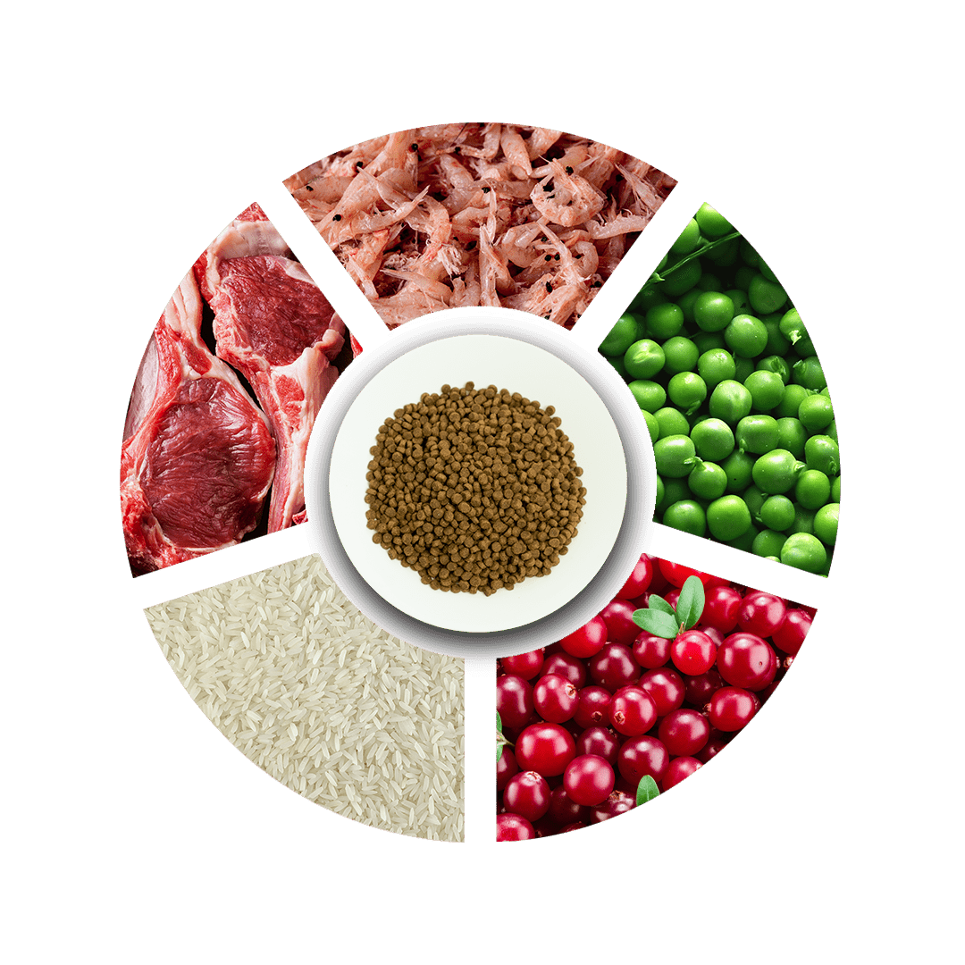 Kurutulmuş Kuzu Proteini, Pirinç (%20), Mısır, Bütün Bezelye, Hayvansal Yağ, Hidrolize Kuzu Proteini, Mısır Gluteni, Kurutulmuş Pancar Küspesi, Maya Özü (Doğal MOS Kaynağı), Somon Yağı, Kurutulmuş Somon Proteini, Kurutulmuş Bira Mayası, Mineraller, Kurutulmuş Karides, Kurutulmuş Kızılcık, Yucca Schidigera.