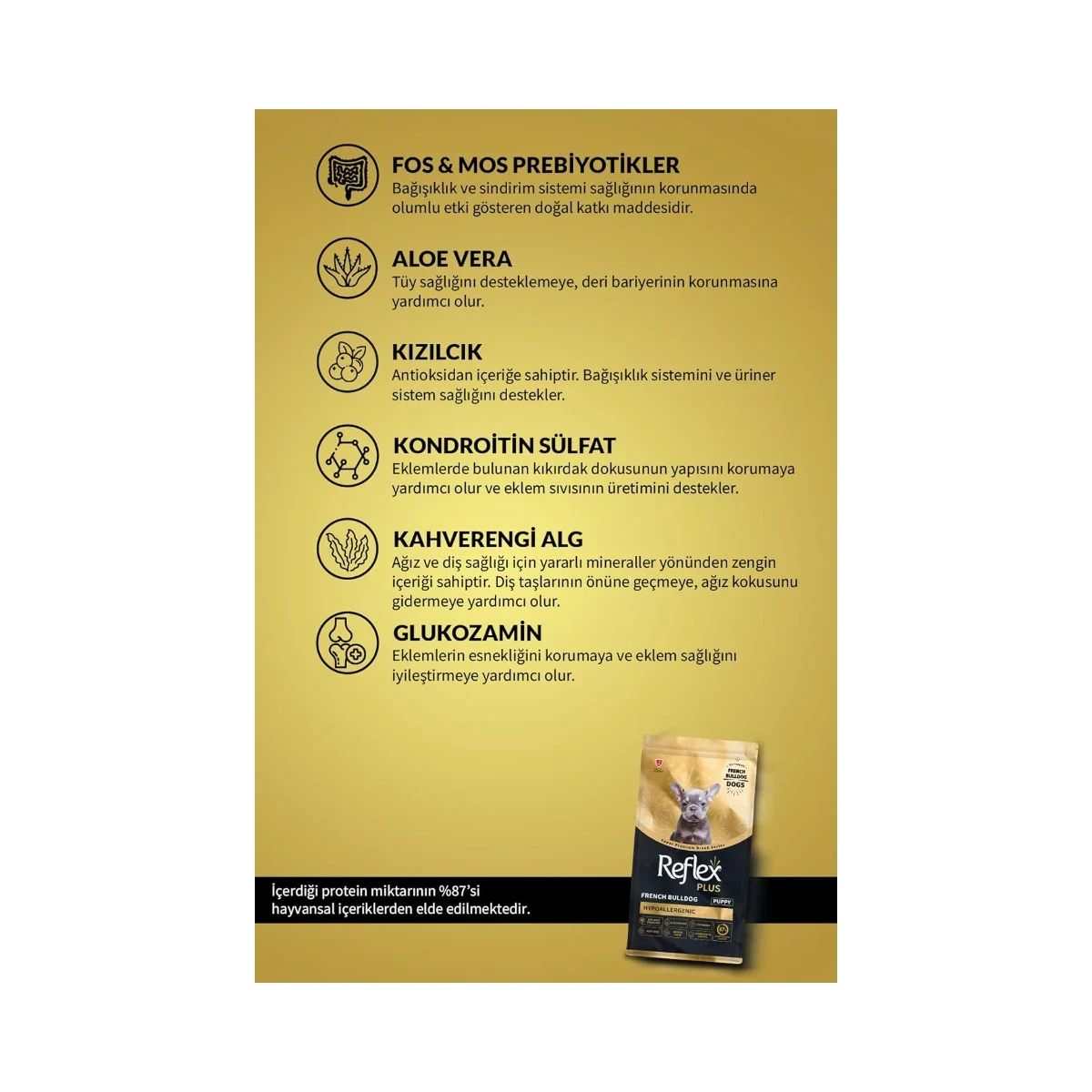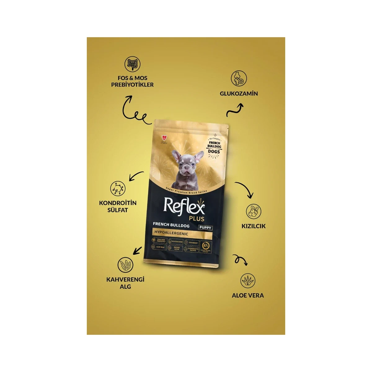 Reflex Plus French Bulldog Puppy, 2-10 aylık French Bulldog ırkı yavru köpekler için özel olarak formüle edilmiş, tam ve dengeli bir süper premium kuru köpek mamasıdır. French Bulldog ırkının kendine özgü yapısı ve gelişim ihtiyaçları gözetilerek hazırlanan bu mama, yavrunuzun sağlıklı büyümesini desteklemek için ihtiyaç duyduğu tüm besin maddelerini dengeli bir şekilde içermektedir.