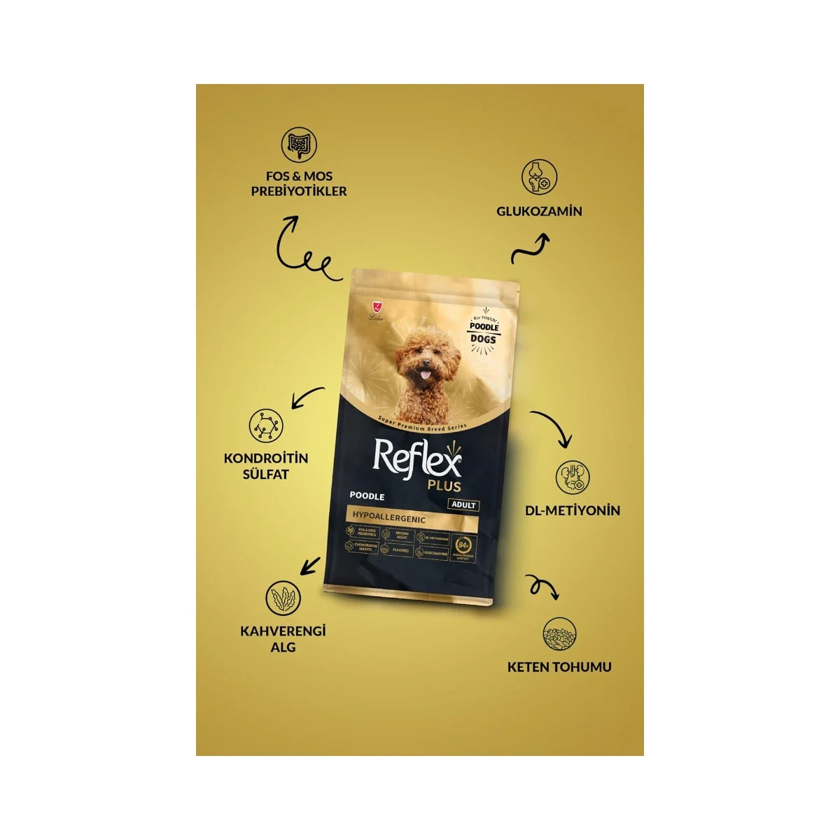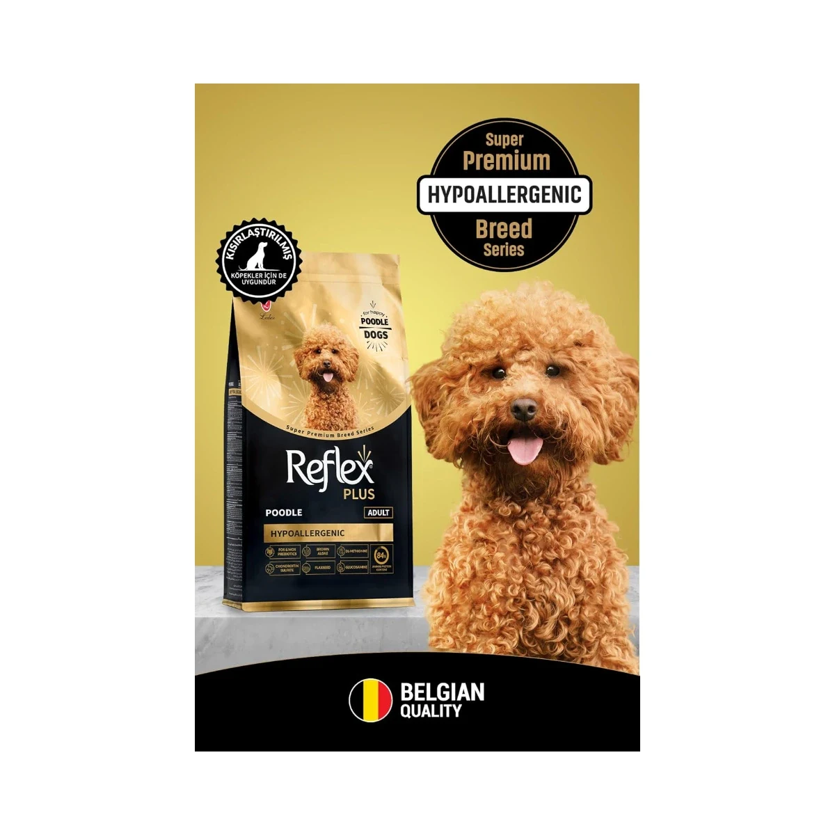 Reflex Plus Poodle Adult, 10 ayını doldurmuş yetişkin Poodle ırkı köpekler için özel olarak geliştirilmiş, hipoalerjenik yapıya sahip bir köpek mamasıdır. Kısırlaştırılmış köpekler için de uygun olan bu formül, Poodle ırkının kendine özgü tüy yapısı, eklem sağlığı ve sindirim sistemi ihtiyaçları gözetilerek tasarlanmıştır.
