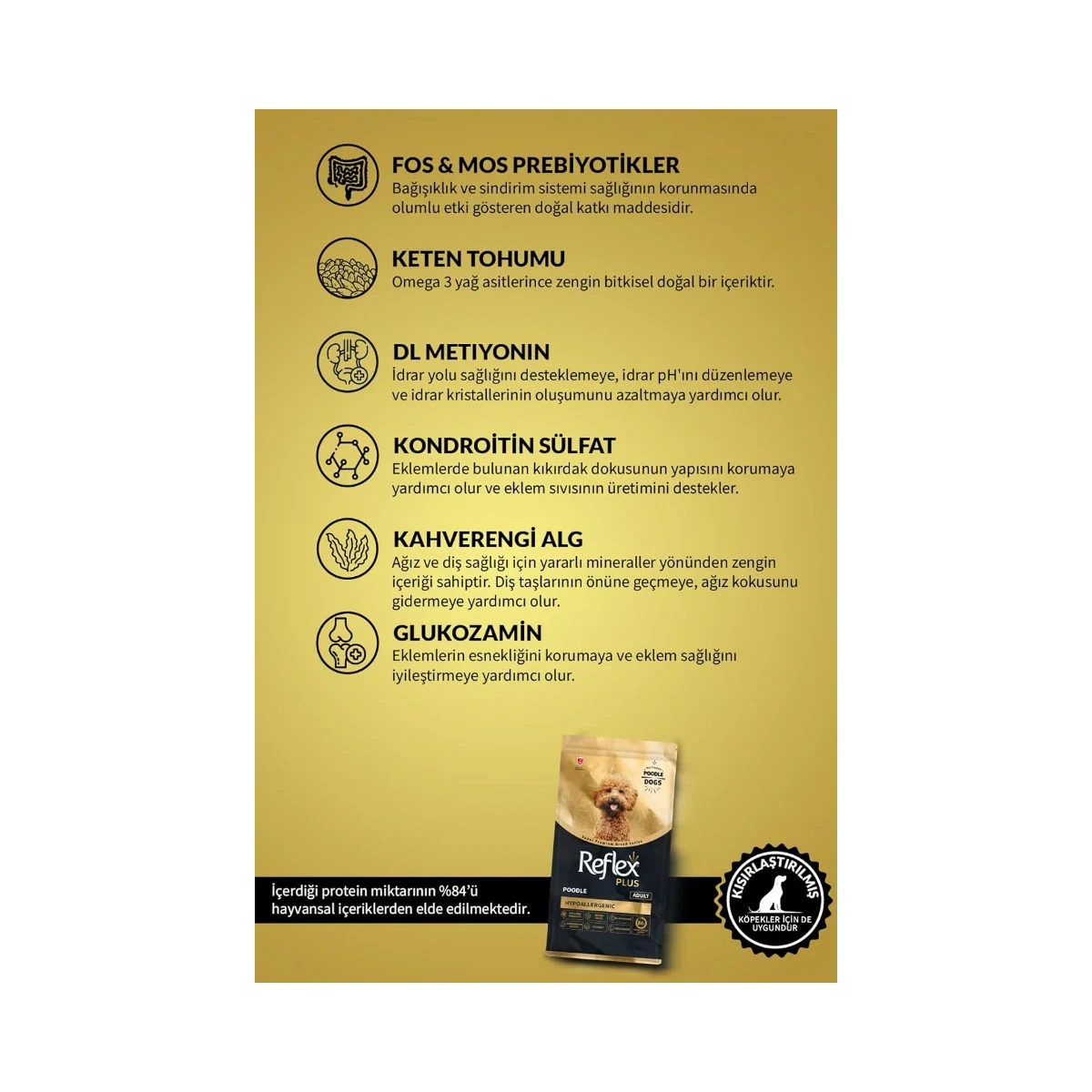 Cevap: Evet. Formülde yer alan Hodan Yağı (Borage Oil), Keten Tohumu ve Balık Yağı; Poodle ırkının yoğun ve kıvırcık tüy yapısı için kritik öneme sahip olan deri ve tüy sağlığını destekler. Bunlara ek olarak Glukozamin ve Kondroitin Sülfat eklem sağlığına, FOS ve MOS prebiyotikleri ile Psyllium lifi ise sindirim sisteminin düzenli çalışmasına katkı sağlar.