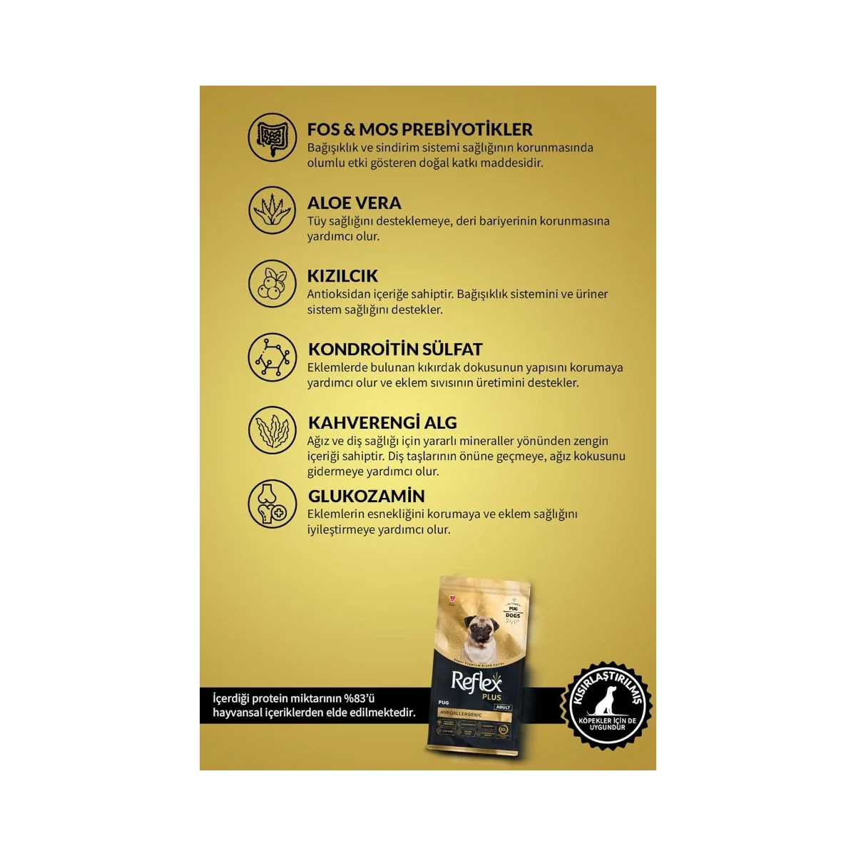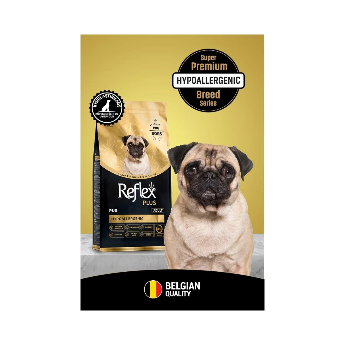 Reflex Plus Pug Puppy, 10 aydan büyük yetişkin Pug köpekler için özel olarak formüle edilmiş, hipoalerjenik süper premium bir köpek mamasıdır. Pug ırkının kendine özgü vücut yapısı, deri kıvrımları ve kilo alma eğilimi göz önünde bulundurularak geliştirilen bu formula; dengeli protein ve yağ oranı ile köpeğinizin sağlıklı ve aktif kalmasını destekler.