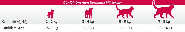 - Günlük verilecek mama miktarı, dış ortam sıcaklığı, kedinizin yaşam şartları (ev içinde/dışında), karakterine ve aktivitesine bağlı olarak değişebilir.