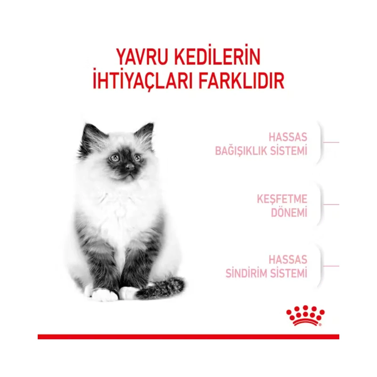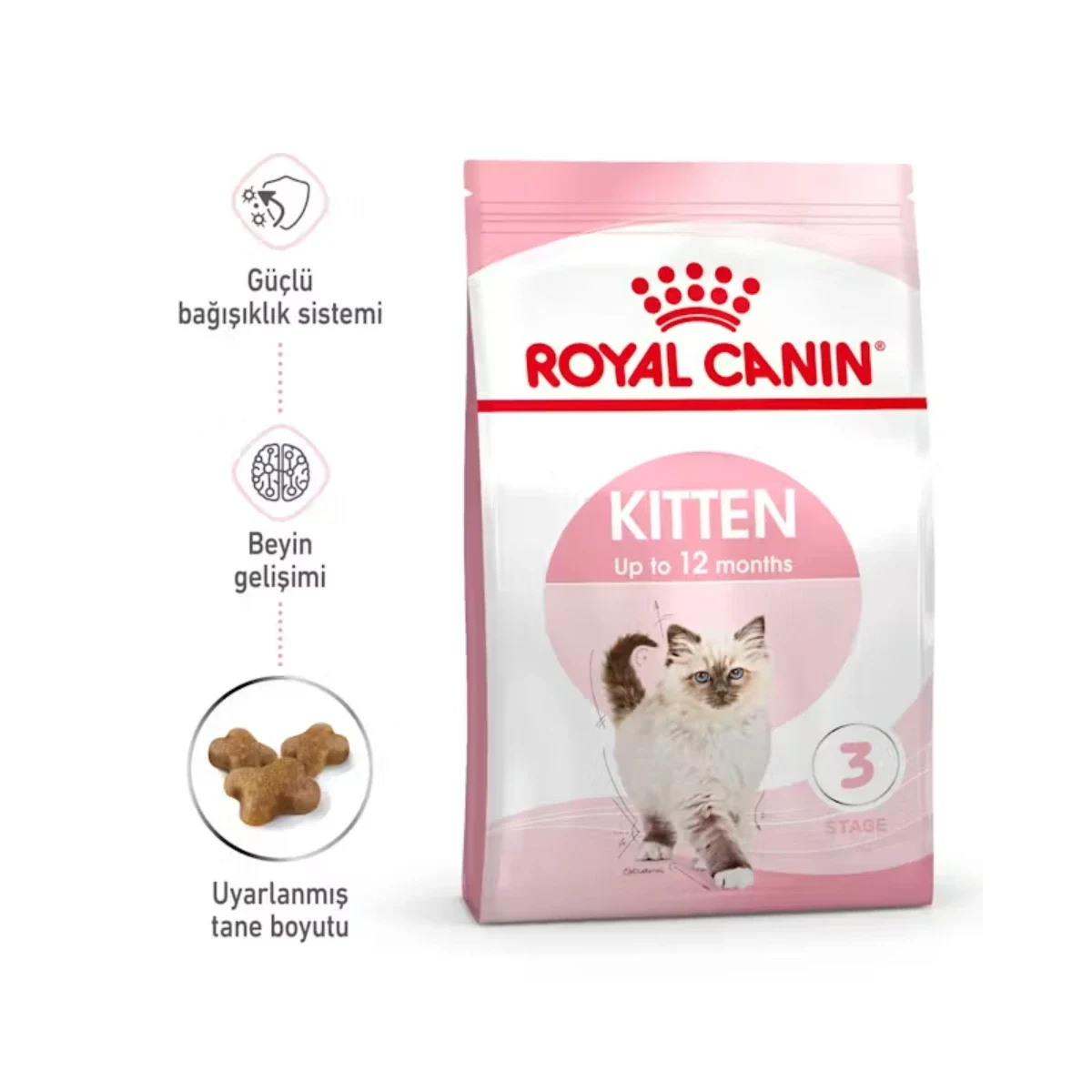 Royal Canin Kitten Yavru Kedi Maması, büyümelerinin “konsolidasyon evresinde” olan yavru kedilerin beslenme ihtiyaçlarını bilimsel temelde karşılamak için özel olarak geliştirilmiş bir tam yemdir. Fiziksel ve davranışsal açıdan hızlı değişimler yaşayan 4 aylıktan 12 aylığa kadar olan yavru kediler için uyarlanan bu formül, enerji ihtiyacını, kemik ve kas gelişimini, bağışıklık sistemini ve sindirim sağlığını tek bir ürünle destekler.