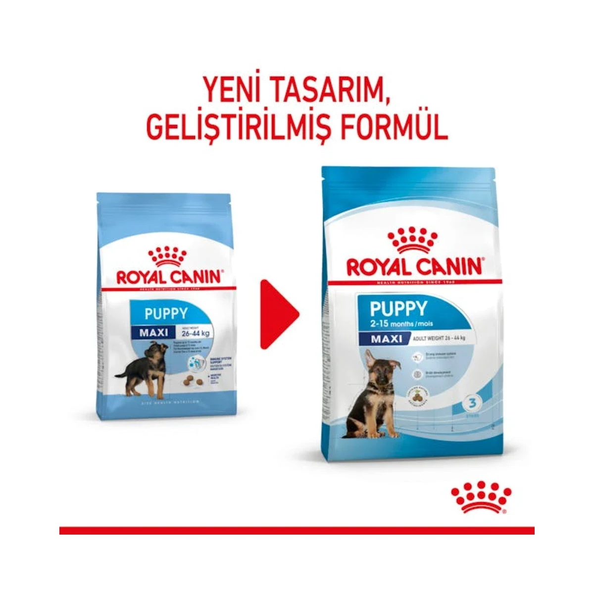 Royal Canin Maxi Puppy, yetişkin dönemde 26-44 kg ağırlığa ulaşması beklenen büyük ırk yavru köpekler için özel olarak geliştirilmiş komple bir mamadır. 2 ila 15 aylık yavru köpeklerin uzun büyüme dönemindeki beslenme ihtiyaçlarını bilimsel temele dayanan bir formülle karşılar. Yapay renklendiriciler ve yapay tatlandırıcılar içermeyen bu formül, doğal antioksidanlarla desteklenmiştir.