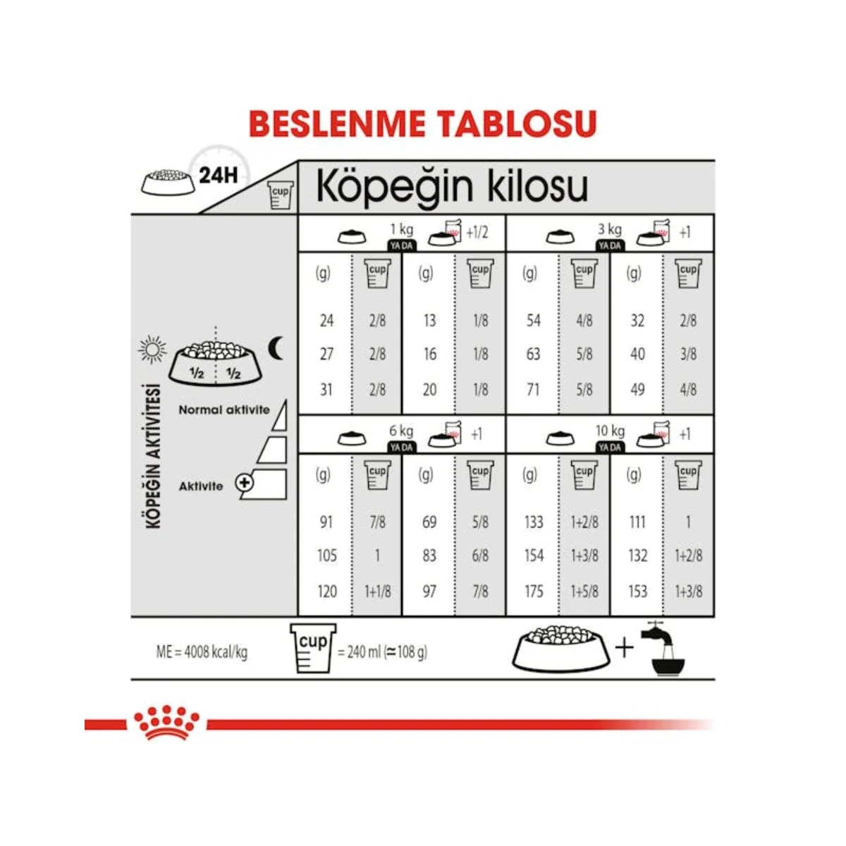 • 3 kg – Düşük Aktivite: 54 g (4/8 ölçek) | Orta Aktivite: 63 g (5/8 ölçek) | Yüksek Aktivite: 71 g (5/8 ölçek)