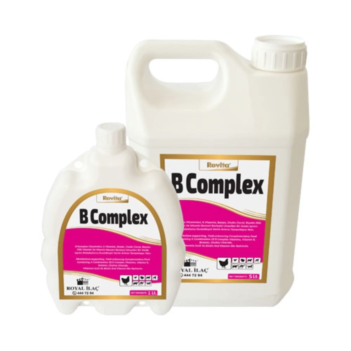 Royal İlaç B Complex 1 L, kanatlılar ve sığırlar başta olmak üzere çiftlik hayvanlarının günlük vitamin ihtiyacını karşılamak, metabolizmayı canlandırmak ve karaciğer sağlığını korumak amacıyla formüle edilmiş kapsamlı bir tamamlayıcı yem çözümüdür. B grubu vitaminlerin yanı sıra K vitamini, betain, biotin, Cholin Clorid ve Niyasin gibi vitamin benzeri besleyici unsurları tek bir ürün altında bir araya getiren bu formül, sürü sağlığına ve verimliliğe doğrudan katkı sağlar.