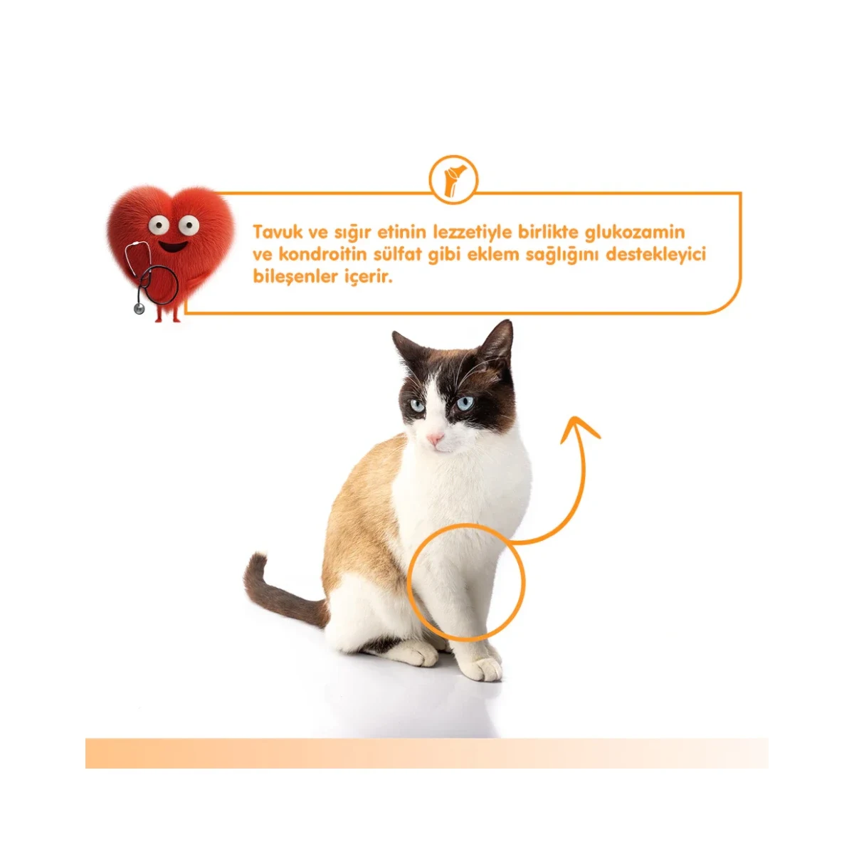 - Eklem Sağlığını Destekler: Glukozamin ve kondroitin sülfat içeriğiyle osteoartrit yaşayan kedilerde eklem metabolizmasını desteklemek için özel olarak formüle edilmiştir.
