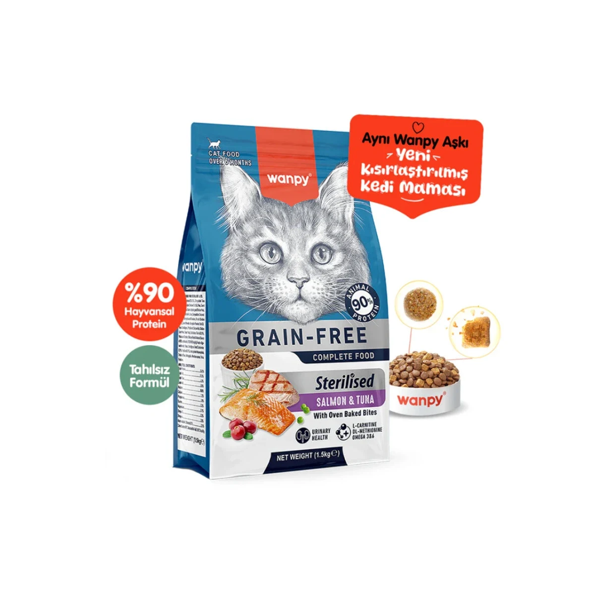 Wanpy Tahılsız Somon & Ton Balıklı Kısırlaştırılmış Kedi Maması 1,5 kg