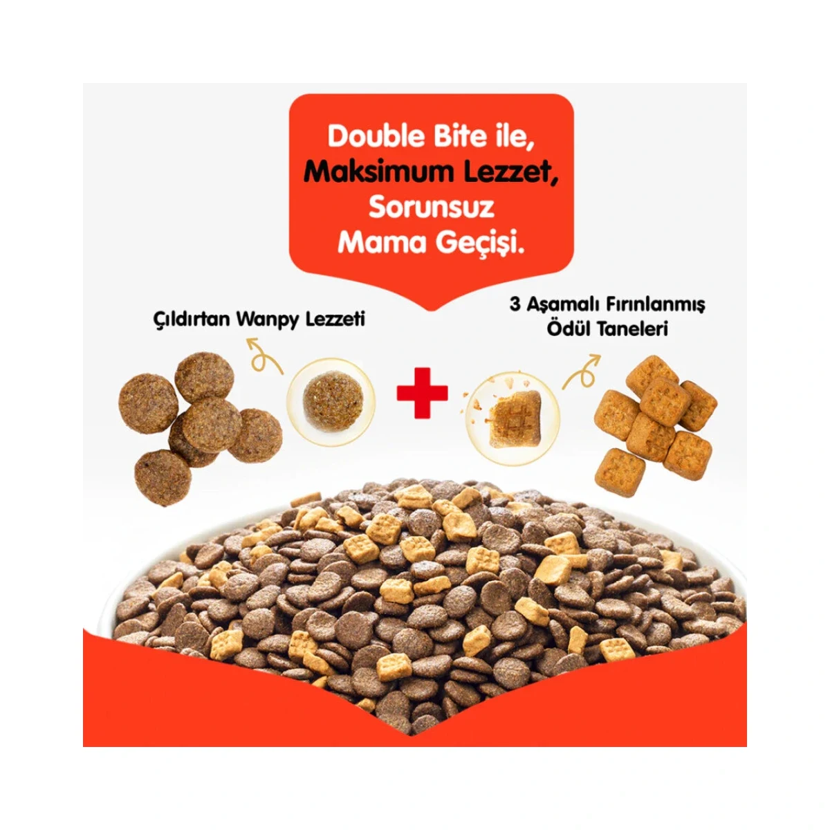 Wanpy’nin özel Double Bite teknolojisi sayesinde mama taneleri düşük ısıda fırınlanmış iki farklı doku ve formda üretilmiştir. Bu yapı hem yüksek lezzet sunar hem de sindirim kolaylığı sağlar. Özellikle başka bir mamadan geçiş sürecinde bu teknoloji, kedinin yeni mamayı daha kolay benimsemesine yardımcı olur.