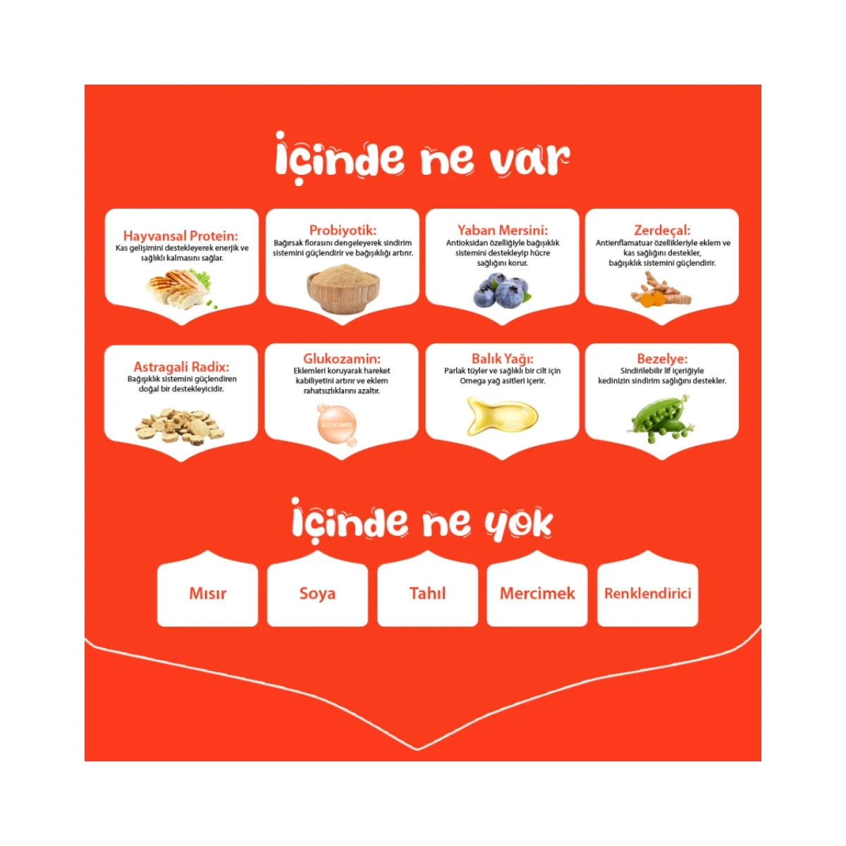 - %84 Hayvansal Protein, Tahılsız Formül: Kurutulmuş tavuk eti ağırlıklı içeriğiyle güçlü kas yapısını destekler; mısır, buğday, soya ve baklagil içermediğinden hassas ve alerjiye yatkın köpekler için güvenle tercih edilebilir.